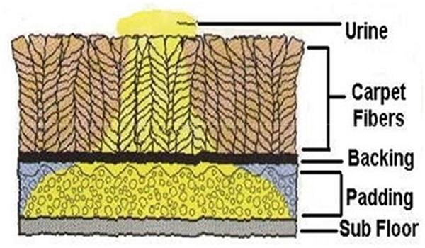 There are two sources of odors associated with urine. The first comes from bacteria that grow abundantly in dark warm places with a never-ending food source. A pet can feed the bacteria daily! This bacteria growth and breakdown of the urine creates amino acids. These complex organic compounds will often work deep into the fibers to a point of becoming part of the fiber. This can present a challenging situation. The waste materials and gases from the decomposing urine create an unpleasant odor. When dried urine is remoistened, it gives off an ammonia gas. If smelled once it is seldom forgotten.